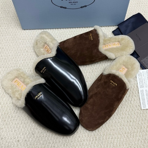 프라다 브러쉬드 가죽 시어링 뮬