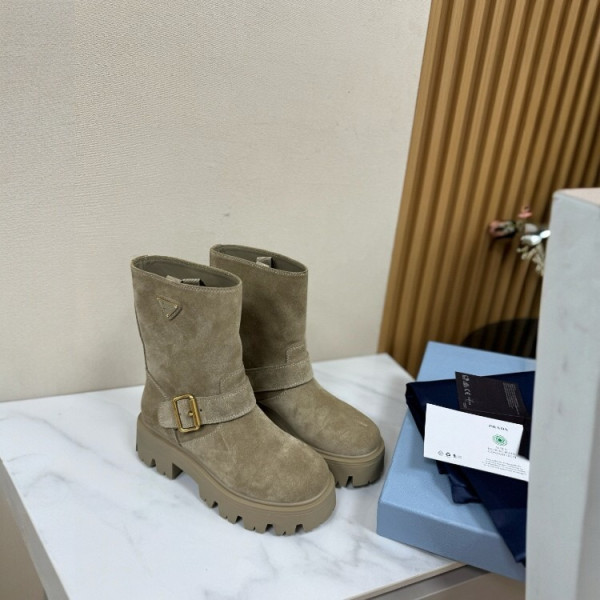 프라다 트라이앵글 로고 가죽 부티 러버솔